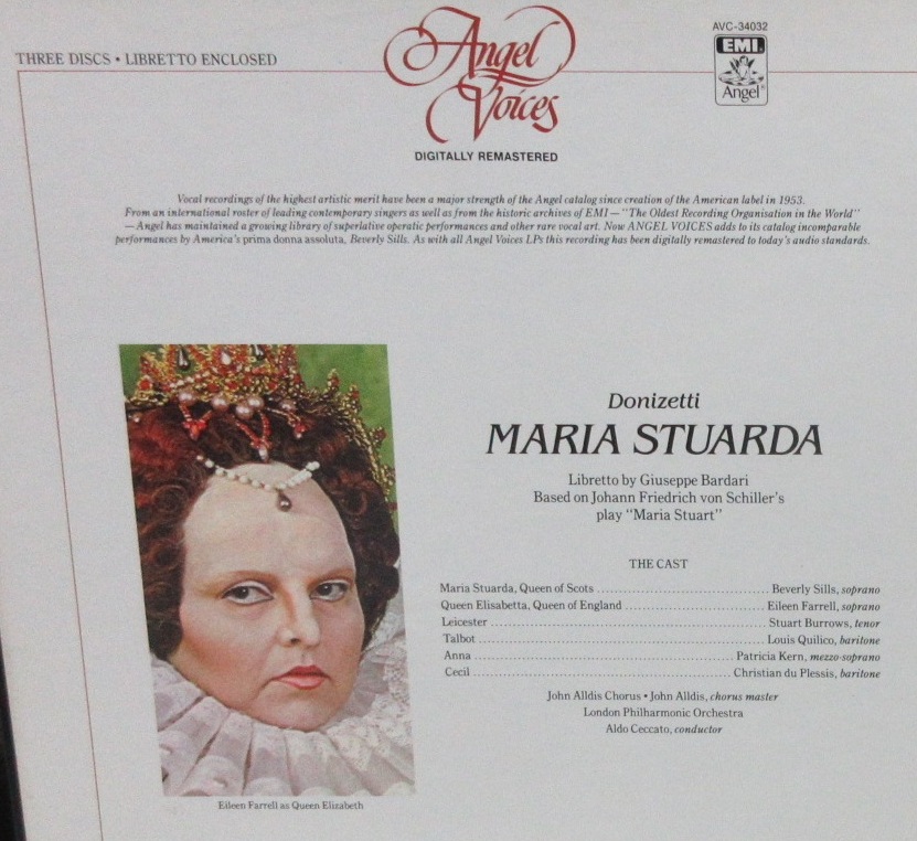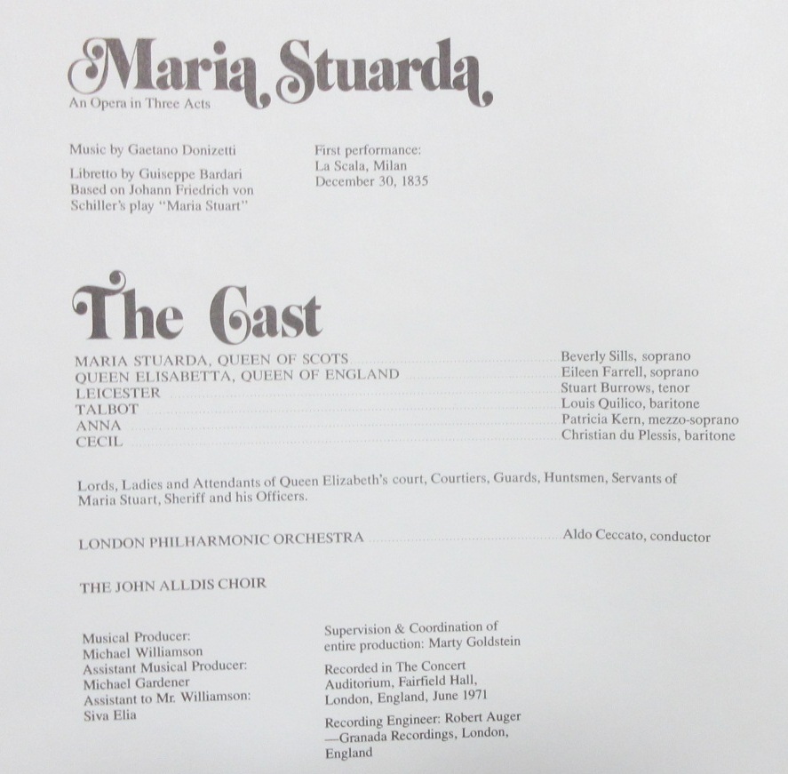 ドニゼッティのオペラの物語ではマリアとエリザベッタがレスター卿をめぐって競合するもエリザベッタは相手にされないという関係にあり、その妬みもマリアを死刑にする原因という設定になっています。そんな展開なのでエリザベッタの方が強い立場、やや悪役的な性格を帯び、キャストによってはそんな性格強く出てきます。この録音のキャストではそういう印象でなく、印象の良さ、まっすぐさ?のような感情の機微は対等な印象に聴こえます。個人的には声質からくる印象はむしろエリザッベタの方に肩入れしたくなりました。しかし、マリア-グルベローヴァの方もさすがに高音が特にきれいで、難なく発声できているようで圧倒されます。